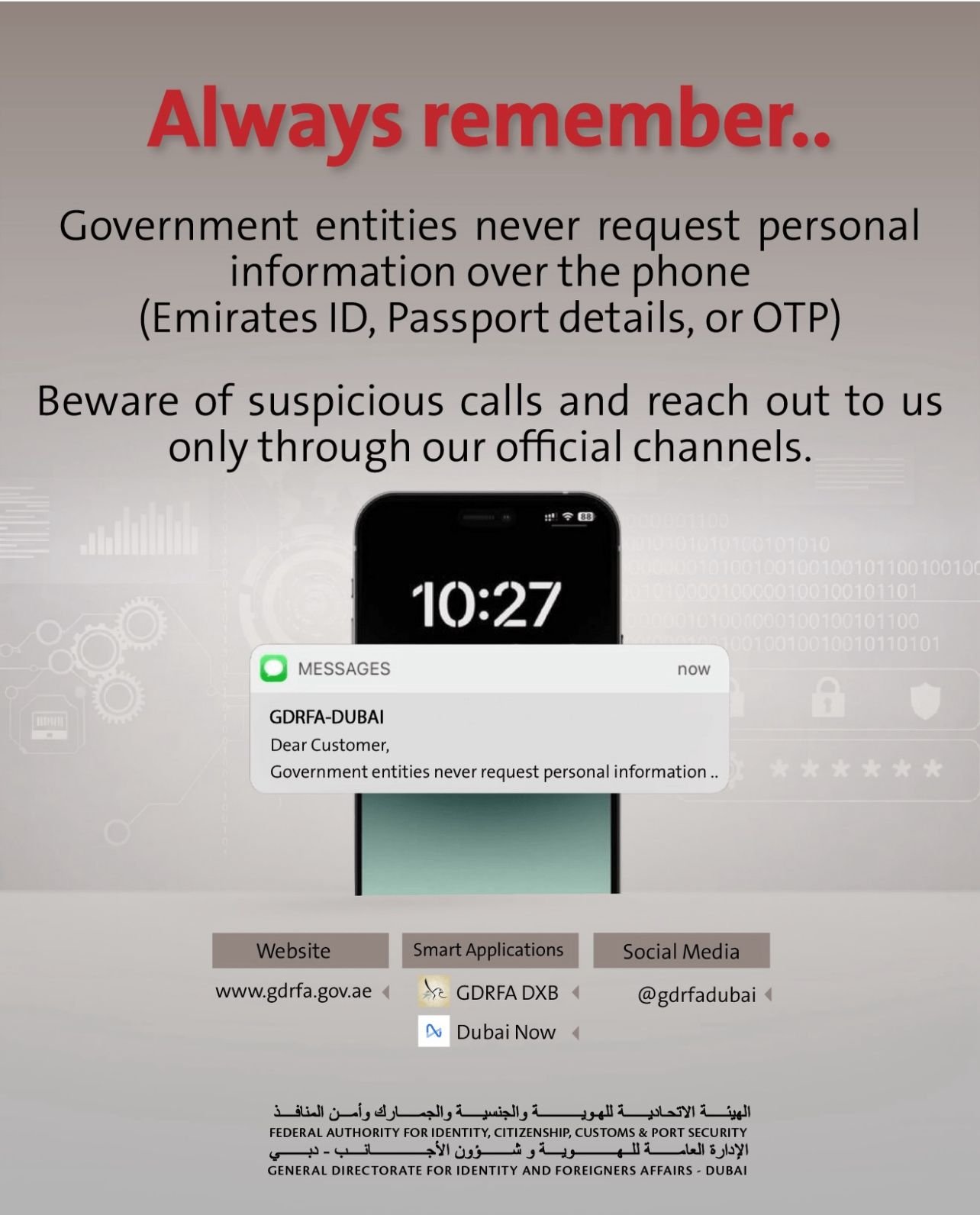 വ്യക്തിഗതവും സാമ്പത്തികവുമായ വിവരങ്ങൾ സുരക്ഷിതമായി സൂക്ഷിക്കേണ്ടതിന്റെ പ്രാധാന്യം ഊന്നിപ്പറഞ്ഞ ജി.ഡി.ആർ.എഫ്.എ, ഔദ്യോഗികവും അംഗീകൃതവുമായ മാർഗങ്ങളിലൂടെ മാത്രമേ സേവനങ്ങളുമായി ബന്ധപ്പെട്ട ആശയവിനിമയം നടത്താവൂ എന്നും നിർദേശിച്ചു.സേവനങ്ങൾക്കും മറ്റു ആവശ്യങ്ങൾക്കും Dubai Now ആപ്ലിക്കേഷൻ, ജി.ഡി.ആർ.എഫ്.എയുടെ ഔദ്യോഗിക വെബ്സൈറ്റ്, മൊബൈൽ ആപ്പ്, @gdrfadubai സോഷ്യൽ മീഡിയ അക്കൗണ്ടുകൾ തുടങ്ങിയ വിശ്വസനീയ പ്ലാറ്റ്ഫോമുകൾ മാത്രമേ ഉപയോഗിക്കാവൂ എന്ന് അധികൃതർ അഭ്യർത്ഥിച്ചു.