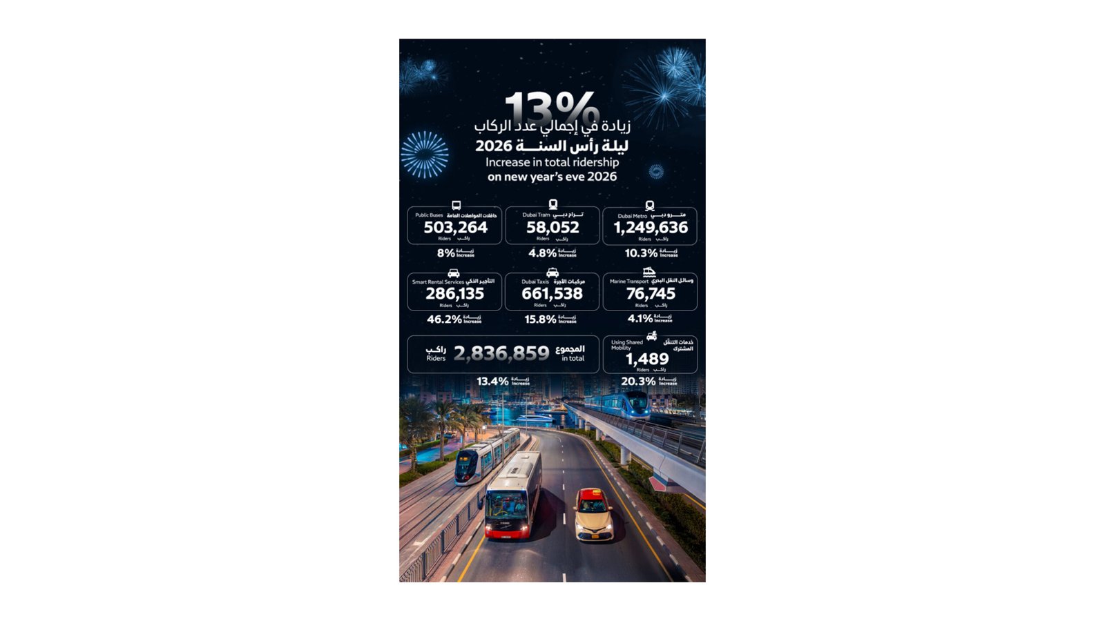 ദുബായ് : പുതുവത്സരാഘോഷങ്ങളുടെ ആവേശത്തിൽ ദുബായിലെ പൊതുഗതാഗത സംവിധാനം പുതിയ റെക്കോർഡ് കുറിച്ചു. 2026ലെ ന്യൂ ഇയർസ് ഈവ് ദിനത്തിൽ റോഡ്സ് ആൻഡ് ട്രാൻസ്പോർട്ട് അതോറിറ്റി (ആർടിഎ) വഴി 28.36 ലക്ഷത്തിലധികം യാത്രക്കാരാണ് യാത്ര ചെയ്തത്. കഴിഞ്ഞ വർഷത്തെ അപേക്ഷിച്ച് 13 ശതമാനത്തിലധികം വർധനവാണ് രേഖപ്പെടുത്തിയത്, വലിയ ആഘോഷങ്ങൾ കൈകാര്യം ചെയ്യാനുള്ള ദുബായുടെ ഗതാഗത സംവിധാനത്തിന്റെ കാര്യക്ഷമത ഇതിലൂടെ വീണ്ടും തെളിഞ്ഞു.