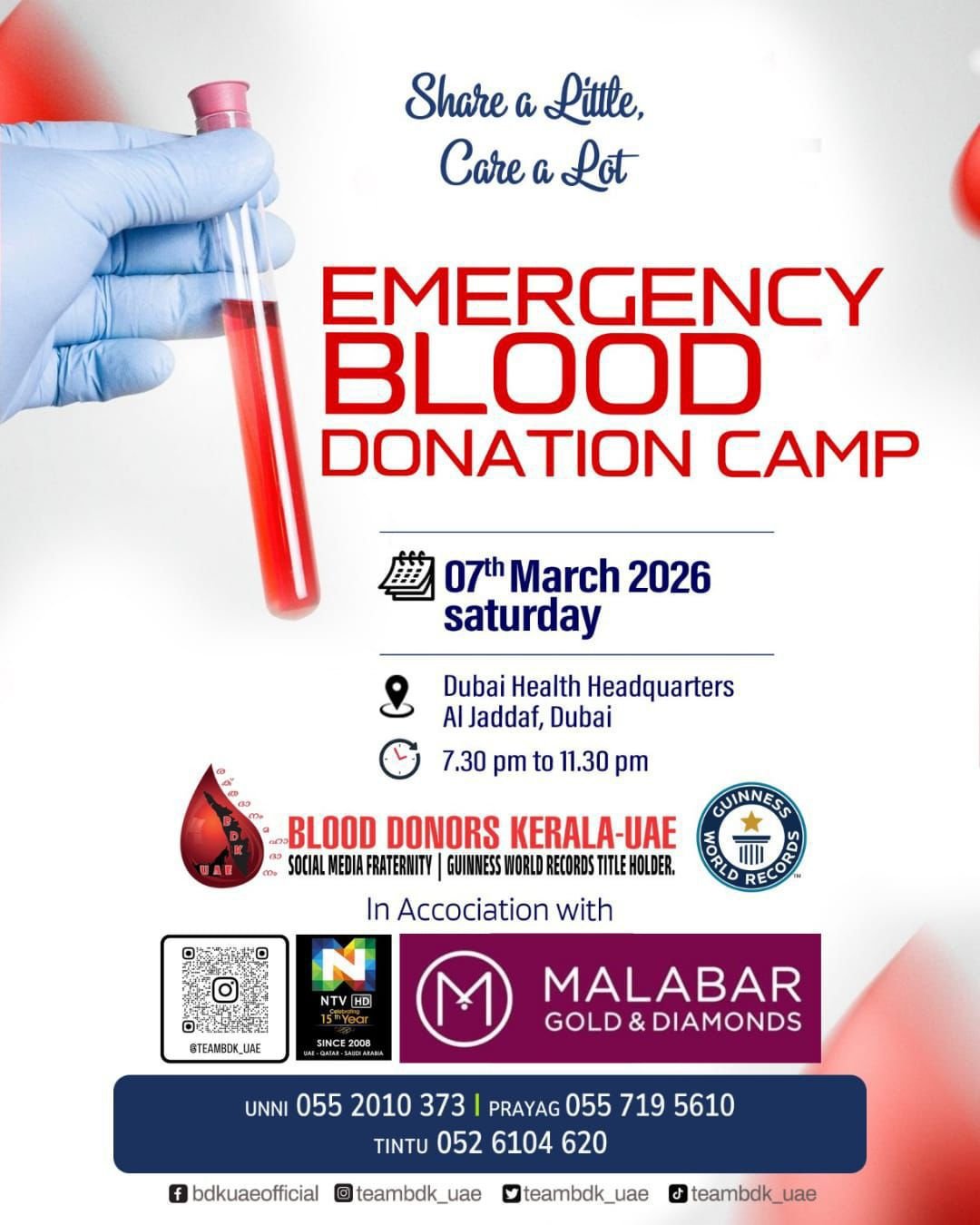 രക്തദാനം ചെയ്യാൻ കഴിയുന്നവർ ക്യാമ്പിൽ എത്തി പങ്കാളികളാകണമെന്നും, കൂടുതൽ ആളുകളിലേക്ക് ഈ വിവരം എത്തിക്കുന്നതിനായി അഭ്യർത്ഥന പങ്കുവെക്കണമെന്നും സംഘാടകർ അറിയിച്ചു.