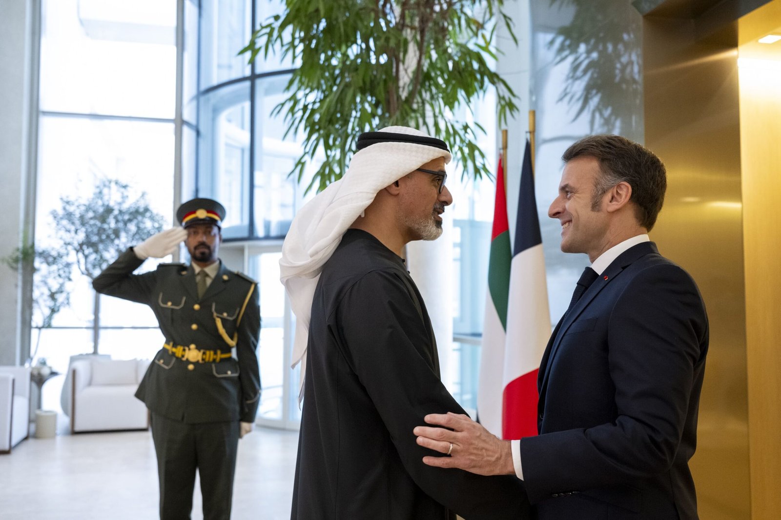മാക്രോയും സംഘത്തിനുമായി പ്രസിഡന്റ് ഉച്ചവിരുന്ന് ഒരുക്കിയിരുന്നു. അബുദാബി കിരീടാവകാശി ഷെയ്ഖ് ഖാലിദ് ബിൻ മുഹമ്മദ് ബിൻ സായിദ് അൽ നഹ്യാന്റെ നേതൃത്വത്തിലാണ് വിമാനത്താവളത്തിൽ മാക്രോയ്ക്ക് സ്വീകരണം നൽകിയത്. യുഎഇ ഉപപ്രധാനമന്ത്രിയും വിദേശകാര്യമന്ത്രിയുമായ ഷെയ്ഖ് അബ്ദുല്ല ബിൻ സായിദ് അൽ നഹ്യാൻ ഉൾപ്പെടെയുള്ള ഉന്നത ഉദ്യോഗസ്ഥരും ചടങ്ങിൽ സംബന്ധിച്ചു.