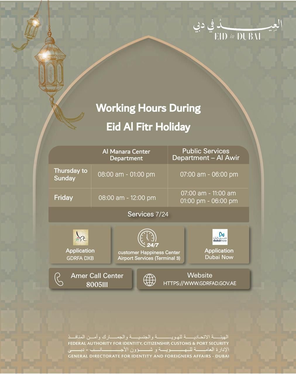 രാവിലെ 7 മുതൽ വൈകിട്ട് 6 വരെ പ്രവർത്തിക്കും. വെള്ളിയാഴ്ചകളിൽ രാവിലെ 7 മുതൽ 11 വരെ, തുടർന്ന് ഉച്ചയ്ക്ക് 1 മുതൽ വൈകിട്ട് 6 വരെ സേവനം ലഭ്യമാകും.ഉപഭോക്താക്കൾക്ക് സേവനങ്ങൾ എളുപ്പത്തിൽ ലഭ്യമാക്കാൻ GDRFA DXB സ്മാർട്ട് ആപ്പ്, DubaiNow ആപ്പ്, ഔദ്യോഗിക വെബ്സൈറ്റ് എന്നിവ ഉപയോഗിക്കാൻ അധികൃതർ നിർദേശിച്ചു.കൂടാതെ, 8005111 എന്ന ടോൾ-ഫ്രീ നമ്പറിൽ പ്രവർത്തിക്കുന്ന Amer കോൾ സെന്റർ 24 മണിക്കൂറും സേവനം നൽകും.ഈ അവസരത്തിൽ, ജി ഡി ആർ എഫ് എ ദുബൈ ഏവർക്കും ഈദുൽ ഫിത്വർ ആശംസകൾ നേർന്നു.