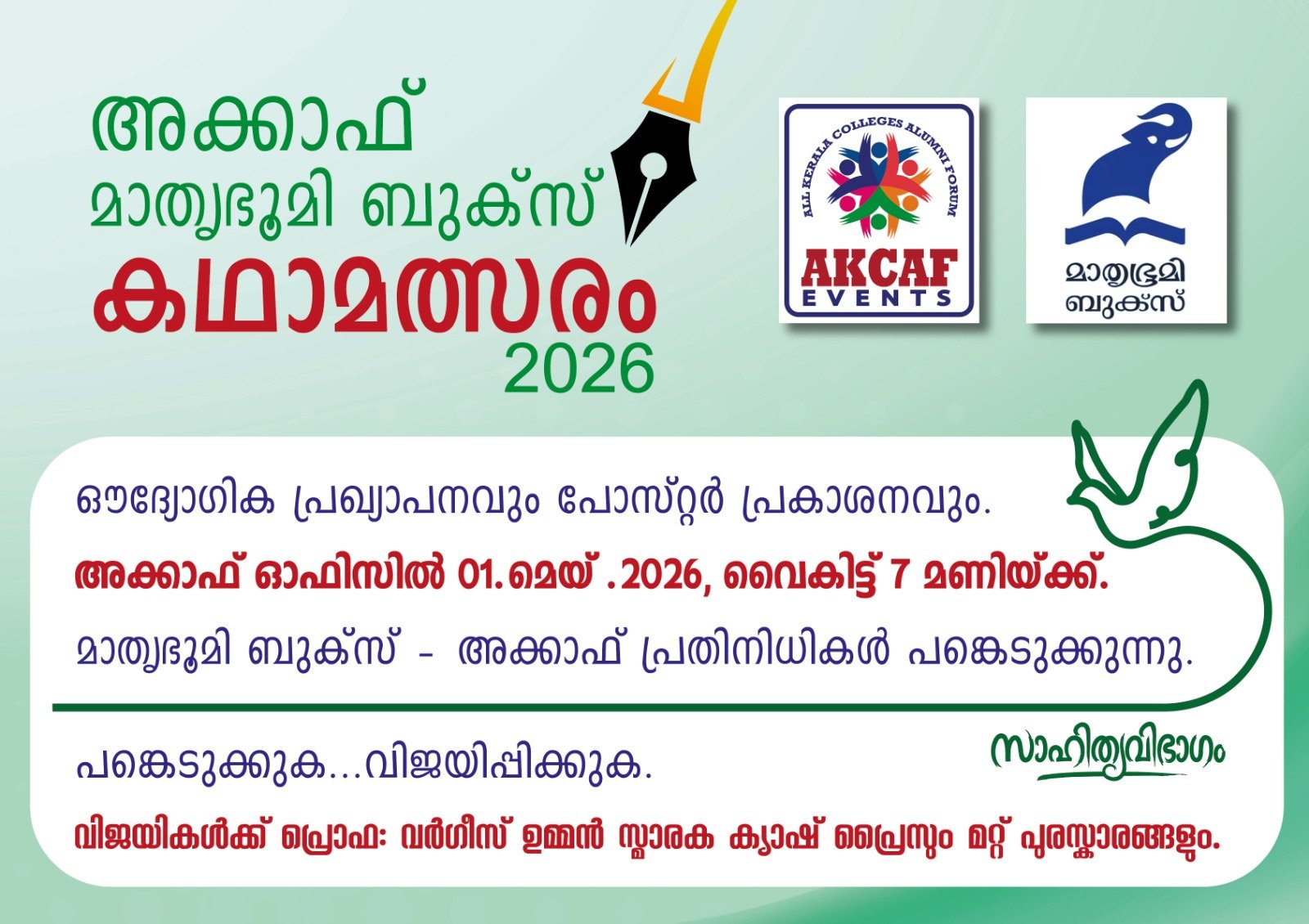 പ്രൊഫസർ വർഗീസ് ഉമ്മൻ സ്മാരക ക്യാഷ് പ്രൈസ് ഉൾപ്പെടുന്ന ഈ മത്സരത്തിന്റെ ഔദ്യോഗിക പ്രഖ്യാപനവും പോസ്റ്റർ പ്രകാശനവും നാളെ (മെയ് 1, വെള്ളിയാഴ്ച) വൈകിട്ട് 7 മണിക്ക് ദുബായിലെ അൽ നഹ്ദയിൽ പ്രവർത്തിക്കുന്ന അക്കാഫ് ഓഫീസിൽ വെച്ച് നടക്കും. ചടങ്ങിൽ മാതൃഭൂമി ബുക്സിന്റെയും അക്കാഫ് ഇവന്റ്സിന്റെയും പ്രതിനിധികൾ പങ്കെടുക്കും.