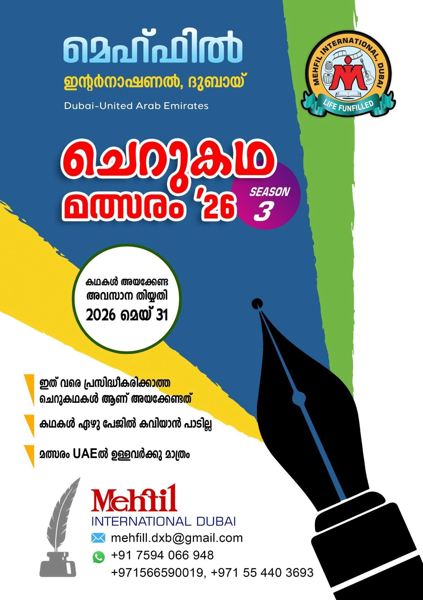 ദുബായ്: സാഹിത്യപ്രേമികൾക്കായി മെഹ്ഫിൽ ഇന്റർനാഷണൽ, ദുബായ് മൂന്നാമത് അന്താരാഷ്ട്ര ചെറുകഥാ മത്സരം സംഘടിപ്പിക്കുന്നു. മത്സരത്തിലേക്ക് കഥകൾ ക്ഷണിച്ചിരിക്കുകയാണ് സംഘാടകർ.