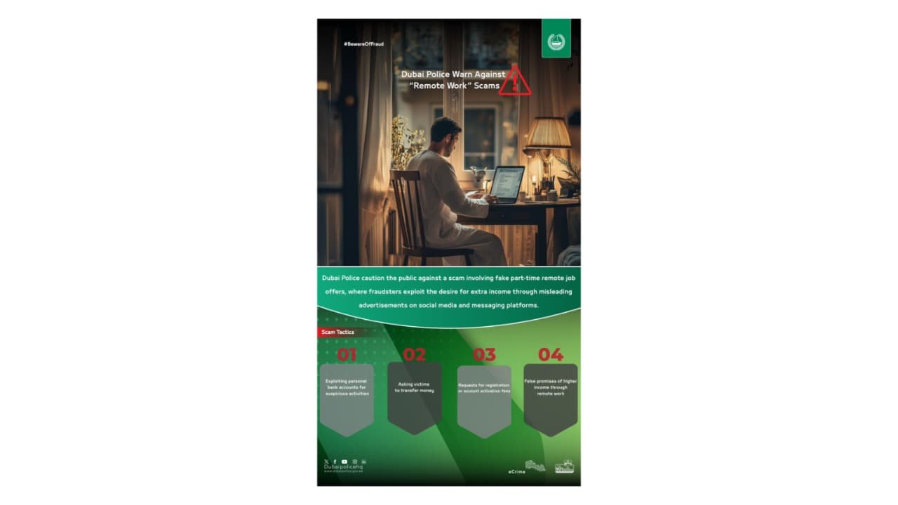 #BewareOfFraud എന്ന കാമ്പയിന്റെ ഭാഗമായാണ് തട്ടിപ്പുകാരുടെ പ്രവർത്തന രീതികൾ ദുബൈ പൊലീസ് വ്യക്തമാക്കിയത്. ജോലിക്കായുള്ള രജിസ്ട്രേഷൻ, അക്കൗണ്ട് ആക്ടിവേഷൻ ഫീസ് എന്നിങ്ങനെ വിവിധ പേരുകളിൽ ഉദ്യോഗാർത്ഥികളിൽ നിന്ന് പണം ഈടാക്കുന്നതാണ് ഇവരുടെ പ്രധാന രീതി. പണം കൈമാറുന്നതിനൊപ്പം തന്നെ വ്യക്തിഗത വിവരങ്ങളും ബാങ്കിംഗ് വിശദാംശങ്ങളും പങ്കിടാൻ ആവശ്യപ്പെടുന്നത് വഴി ഇരകളുടെ സാമ്പത്തിക ഭദ്രത പൂർണ്ണമായും അപകടത്തിലാകുന്നു. ചില സന്ദർഭങ്ങളിൽ, ഉദ്യോഗാർത്ഥികളുടെ ബാങ്ക് അക്കൗണ്ടുകൾ അവരുടെ അറിവില്ലാതെ തന്നെ നിയമവിരുദ്ധമായ പണമിടപാടുകൾക്കായി (Money Laundering) തട്ടിപ്പുകാർ ദുരുപയോഗം ചെയ്യാറുണ്ടെന്നും ഇത് ഇരകളെ വലിയ നിയമക്കുരുക്കുകളിൽ എത്തിക്കുമെന്നും പൊലീസ് മുന്നറിയിപ്പ് നൽകി.
