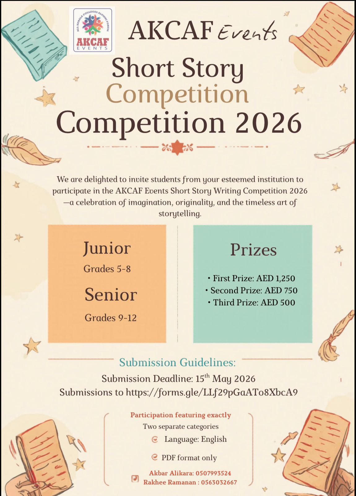 മത്സരത്തിൽ പങ്കെടുക്കാൻ ആഗ്രഹിക്കുന്ന വിദ്യാർത്ഥികൾ അവരുടെ കഥകൾ മേയ് 15-നകം സമർപ്പിക്കണം. കൂടുതൽ വിവരങ്ങൾക്കായി സംഘാടകരുമായി ബന്ധപ്പെടാവുന്നതാണ്.